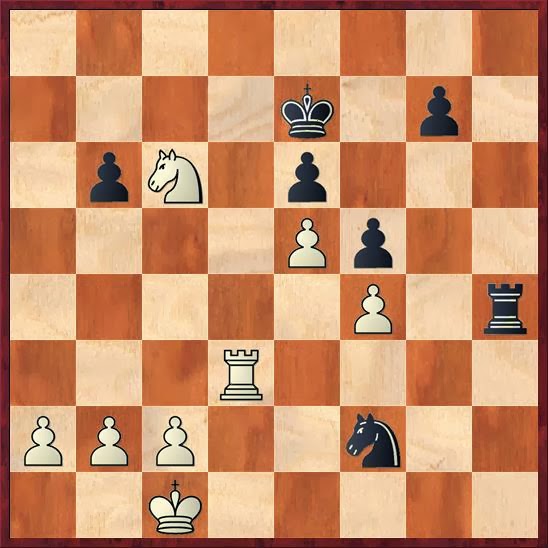 試合後に彼が悔やんだのがこの一手。f4 はどうしても守れないので、bポーンを取ってパスポーンレースにする展開が白の取るべき道だと私は考えていました。しかし、実際はそれも怪しく、正しくはe6 を取りにいって、センターにパスポーンを作るのが白の正しいプランでした! 31. Rd8+! Kf7 32. Rd7+ Kg8 (32... Kf8? 33. Nd4!+-) 33. Nd4 Rh1+ 34. Kd2 Ne4+ 35. Ke2 Rh2+ 36. Kf1 g5 37. Nxe6+/-